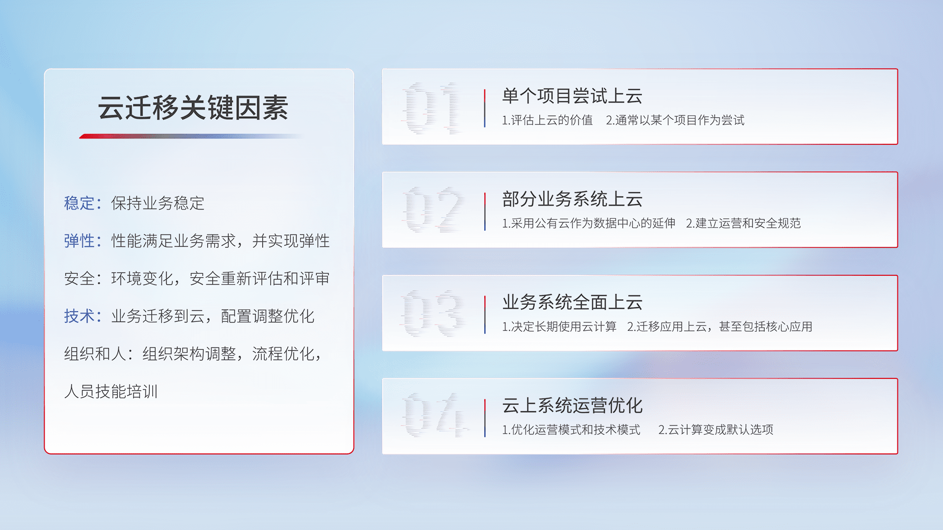 结合实际业务,,,,从规划设计、、云平台选型、、云原生改造、、数据迁移、、、集成交付,,迁移全过程为客户识别最佳上云路径,,,做好风险识别管理,,,,设计网络架构、、身份权限、、、安全审计合规、、、操作审计、、日志审计、、监控告警策略、、多站点容灾设计等,,,,对云上基础设施进行整体规划,,,提升IT治理水平,,,以满足弹性、、高可用、、、、高性能的需求。。。